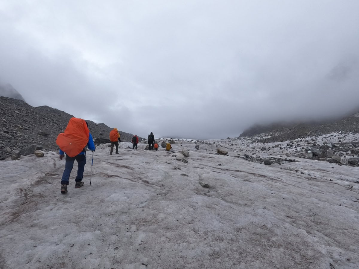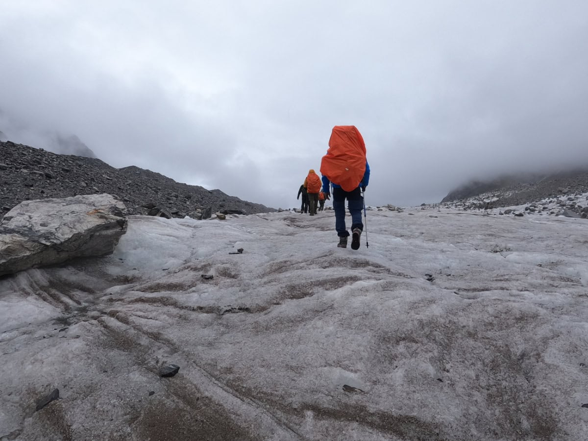 Seven hours crossing lateral moraines (a mass of rocks and sediment carried down and deposited by a glacier, typically as ridges at its edges). Your boots crunch on loose scree (loose stones that cover a slope on a mountain). Ropes come out for the technical sections. This is mountaineering now, not just hiking. You’ll camp directly on glacier ice, centuries of compressed snow beneath your tent floor (wow!).